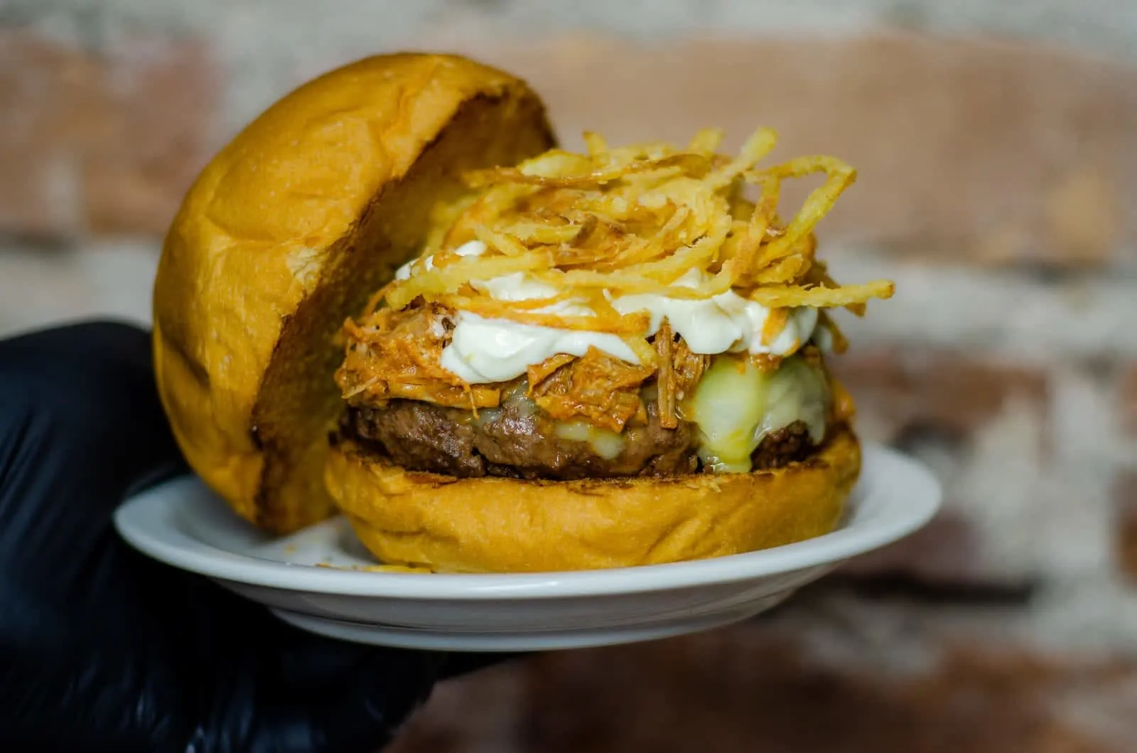 Hambúrguer 180g, queijo minas padrão, pernil de porco desfiado, cebola crispy e maionese caseira.